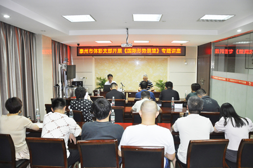 为深入学习贯彻习近平新时代中国特色社会主义思想,纪念中国人民解放军建军96周年,8月4日,泰州市体育局党委邀请泰州市委军民融合办副主任、市发改委党组成员、二级调研员、原江苏省军区教导大队大队长陈海俊同志作“国际形势展望”讲座,泰州市体育局机关支部、体校支部、体育中心支部的支部委员及泰州市体彩中心全体人员聆听了讲座。