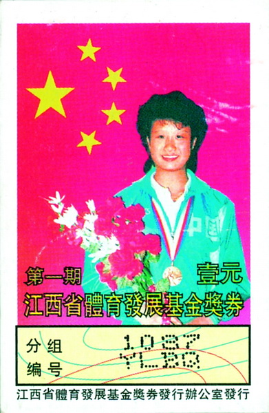 1993年初,江西省为振兴和发展江西体育事业,成立了江西省体育发展基金会,为了更好地募集社会资金,发行了1套3枚的“第一期江西省体育基金奖券”其中一枚票面是许艳梅站在五星红旗下,手捧鲜花,胸挂金牌领奖的摄影画面。这张彩票成为了我国首枚奥运冠军作为票面的彩票。
