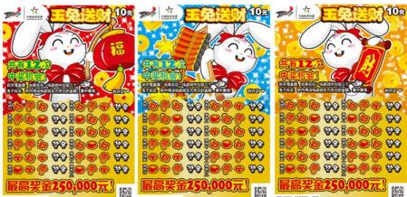 今年,又是一个兔年,憨态可掬的小兔子再次跃上中国体育彩票的票面,在年初发行的顶呱刮彩票上可爱的小白兔手提灯笼、鞭炮和对联给广大彩民“送财”来啦!这套彩票共3枚,每张彩票面值10元,共有12次中奖机会,刮开覆盖膜,如果在任一场游戏中出现三个兔子标志,即中得该场游戏右方所示的金额,最高奖金达到25万元!而覆膜的制作更加精美,不像12年前单一的银灰色,而是印制了小白兔喜爱的食物——白菜、蘑菇等,使得票面更加吸引人,更增添了游戏的乐趣。