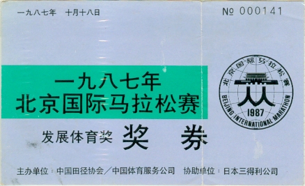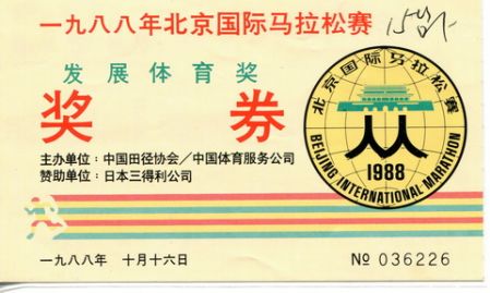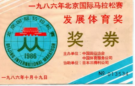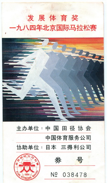 新中国的第一张体育彩票--发展体育奖北京国际马拉松赛奖券于1984年10月10日在北京发行。奖券为传统型,散式,无面值,售价2元,计发行50000张。奖券的上方为白底,印有发展体育奖 一九八四年北京国际马拉松赛,正面是7名运动员在跑道上拼跑的抽象图,下方为主办单位:中国田径协会中国体育服务公司,协助单位日本三得利公司,并印有奖券对奖号码。背面是印的1985年年历。