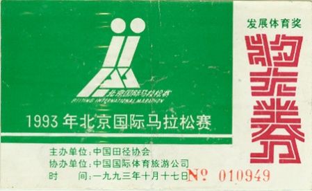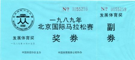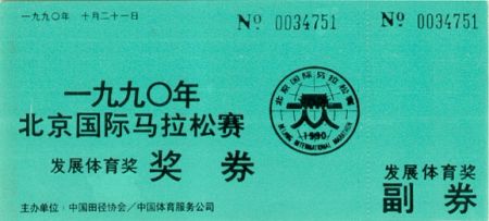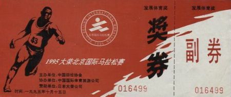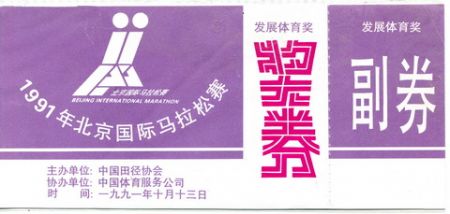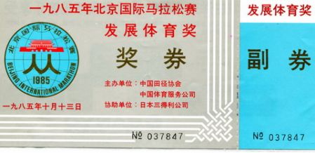 此后,1985年至1995年共11届北京国际马拉松赛都发行了传统型的“奖券”,均为横式,发行数量除1989年发行60000枚外,其余均为50000枚。为获得赞助,自1995年起开始在背面印有商业广告。由于国务院批准发行中国体育彩票,1995年印的北京马拉松赛奖券也未能发行。