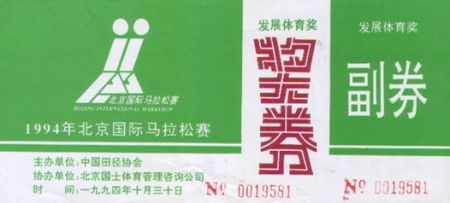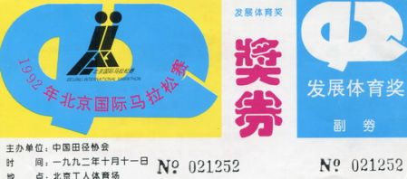 附:1984年至1995年北京马拉松赛奖券,供欣赏。(华明)