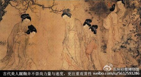 到了唐代,鞠的制法有了很大的改进,由原先的实心球变成空心球,把经过整治的皮张裁成小块,再缝成圆形球,里面放置用动物尿泡做成的球胆。它不仅轻,弹性也很好,可以踢得又高又远。这样对体力的要求就低了,就有了女子踢球。女子踢球可以单人踢,也可以多人踢,只要能够踢出花样来就可以取胜。