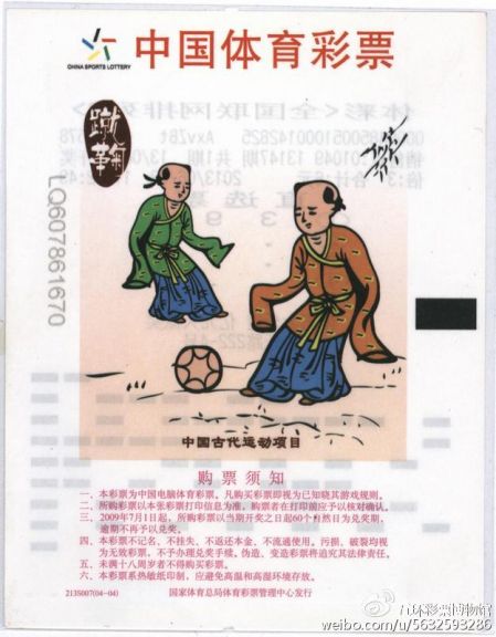 1989年8月8日,由第十一届亚运会基金会发行的《第十一届亚运会基金奖券》彩票品种多达12组198枚,至今仍保持着我国彩票发行史上单次品种与数量最多的最高纪录。彩票图案包刮吉祥物与亚运史、吉祥物与日历、邮票与日历、体育馆体育场、邮票与赛马、中国古代体育经典壁画砖画等,其中就有1枚反映中国古代体育经典“蹴鞠”的彩票。