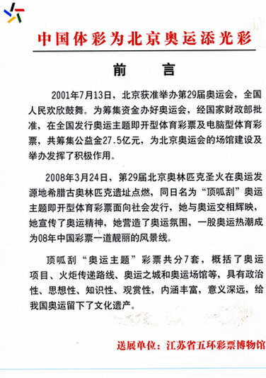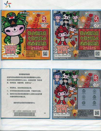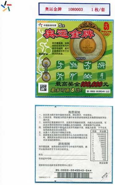 奥运主题彩票是中国体育收藏品奥运主题的一个重要组成部分,它不仅是由权威机构发行、有统一编号、防伪功能,而且设计新颖,印制精美,同时发行时间短,存世量较小,具有收藏和欣赏价值。(华明)