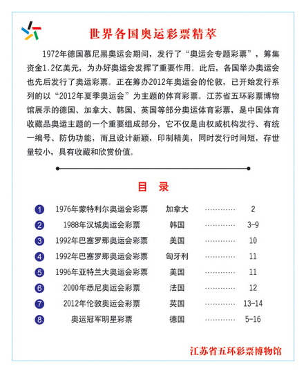 在展出的奥运主题彩票中,还有德国、加拿大、美国、韩国、英国等主办国及其他国家发行的奥运彩票。
