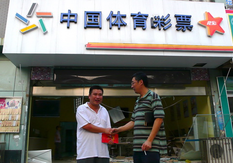01726站点,距离爆炸中心不过数百米,所有门窗玻璃都被震碎,其中里面的门已经被震飞出去。中心领导前去慰问时,向销售人员了解受灾情况,得知建筑受损,人员基本无碍,连声说,人没有事就好。随后,给销售人员送上慰问金,销售人员激动地说:“真没想到这么快领导就会来看望我们,对我们来说真是雪中送炭。”旁边的群众也都说,还是体彩的领导关心人,我们都要支持体彩。