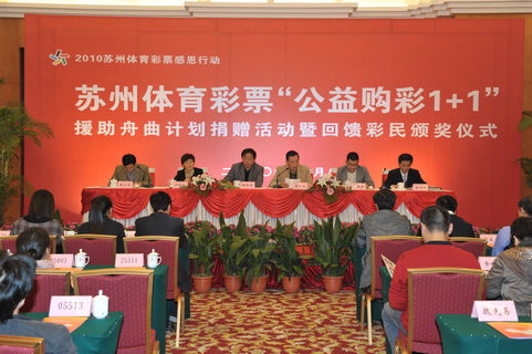 11月8日下午1:30,苏州体育彩票“公益购彩1+1”援助舟曲计划捐赠活动暨回馈彩民颁奖仪式在苏州市会议中心举行。苏州市体育局局长鲍东东、副局长袁永球,市红十字会副会长严晓凤、城市商报副总编张俊启、市体彩中心副主任金佳明出席启动仪式,会议由市体彩中心主任朱小龙主持。