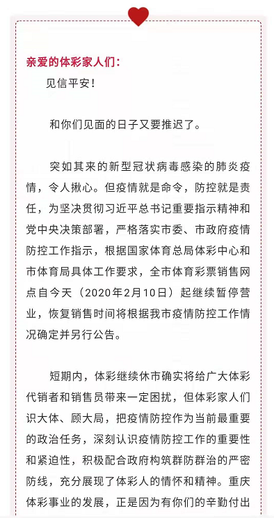 “亲爱的体彩家人们:见信平安!和你们见面的日子又要推迟了……短期内,体彩继续休市确实将给广大体彩代销者和销售员带来一定困扰,但体彩家人们识大体、顾大局,把疫情防控作为当前最重要的政治任务,深刻认识疫情防控工作的重要性和紧迫性,积极配合政府构筑群防群治的严密防线,充分展现了体彩人的情怀和精神。”这是重庆体彩中心《致全市体彩代销者的一封家书》。