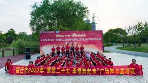 2022年是喜迎党的二十大胜利召开的一年。为了大力营造广场舞喜迎“二十大”的浓厚氛围,用广场舞开展“歌颂党,感恩党,紧跟党”的宣传教育,唱响主旋律、壮大正能量,为百姓多方搭建便于参与、乐于参与的广场舞展演平台,以深受广大群众喜爱的广场舞活动为载体,为全市城乡村(居)民提供一项具有专业性、多项性的广场舞公益培训活动,深入实施省广场舞“一三三三工程”,促进宿迁市广场舞活动大普及、大推广、大提高,掀起全民健身热潮,由江苏省体育总会、宿迁市体育局、宿迁市体育总会秘书处主办,江苏省体彩中心、江苏省广场健身舞运动协会、宿迁市广场健身舞运动协会承办,圣美伦化妆品集团、南京银行、牛首山文化旅游集团、燕谷坊集团江苏公司、梦幻迷宫生态农业公司协办的宿迁市“喜迎二十大 幸福舞起来”2022年省广场舞公益培训进社区进乡村培训班于5月22日下午在宿迁市区九鼎公园举办。