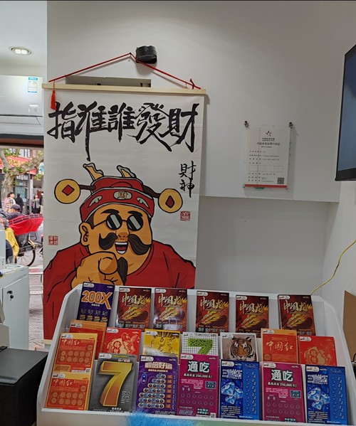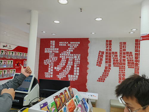 店门口有一个粉红色的邮箱,上写着“我❤扬州”,甚是可爱,有了这个邮箱,网点的销售员清理刮过的即开票的任务减了大半。因为很多购彩者朋友刮完彩票,如果没有中奖要亲自把票放进邮箱,说是要寄出一份愿望,从而收获一份幸运。店里试试手气的选票墙,按一下开关选票墙机关开启,随着音乐光标开始流动,音乐结束光标停在哪里,就是选票墙为你选择的即开票。另外店里扬州方言和各种“梗”组成的“扬州”网红墙;指谁谁发财的炫酷财神;网络热门词条以及不忘提醒理性投注的霸气柜台……无不透露着热情、活力、希望和努力,让人感受到爆棚的正能量。