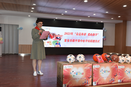 淮安市和平镇中心学校校长张祥军为此次活动致欢迎词,他表示,此次淮安体彩的捐赠活动在一定程度上解决了体育器材短缺的困难,必将促进学校的体育工作更好的开展,同时还将以本次捐赠活动为契机,进一步深化课程改革,力争开发更多、更好的特色课程,促进孩子们全面、健康、活泼的成长,把学校办成一所孩子们喜欢的学校,为乡村振兴作出应有的贡献。