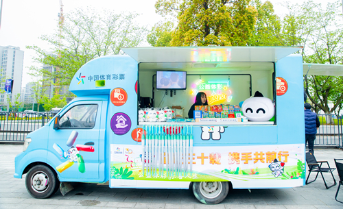 来自“苏州体彩追梦人郑惠君公益小队”的志愿者们在现场开展体育彩票“顶呱刮”公益义卖活动,销售产生的所有代销费收入将全额捐赠给贫困山区小学,用于改善硬件设施。