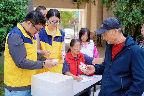 重阳节前,无锡体彩联合梁溪区文明办、北大街街道等单位走进北大街长庆路社区,为老人们带来文娱表演、磨刀、理发、测血压血糖等服务。无锡体彩党员志愿者积极参与,并为社区困难家庭、困境保障对象、百岁老人等群体送去体彩的慰问,切实把关爱带到他们身边。活动尾声,志愿者为小区65周岁以上的老人分发了重阳糕,亦是送上最诚挚的节日祝福。