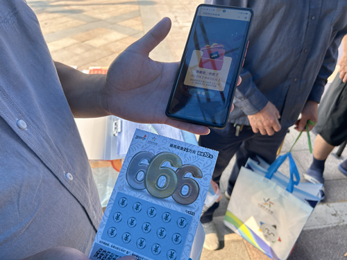 体彩工作人员耐心指导大家如何线上报名,通过扫描活动现场宣传物料中的活动二维码,登录中国体育彩票微信小程序完成预约报名、参与比赛、获取积分、参与抽奖等活动流程。张先生被现场热闹的氛围所吸引,通过现场工作人员介绍,得知是棋王争霸赛活动,便第一时间扫码线上踊跃报名,没想到幸运降临,抽到了体彩大礼包,让他兴奋不已,直言体彩棋王争霸赛活动不仅有趣还有“礼”!