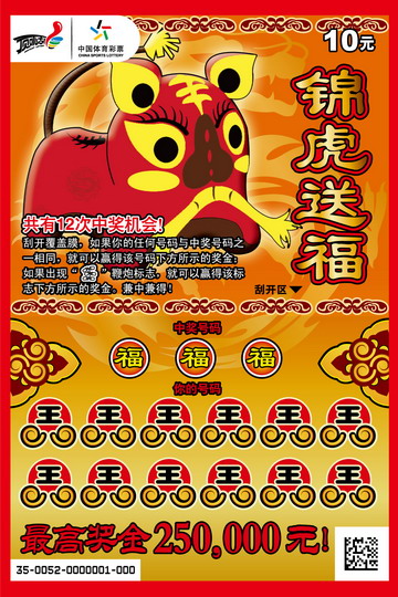 除了“财神到”,顶呱刮贺岁版中还有两位新朋友,“锦虎送福”和“拜年啦”。“锦虎送福”每张面值10元,共有12次中奖机会,最高奖金为25万元;“拜年啦”每张面值5元,共有8次中奖机会,最高奖金为10万元。