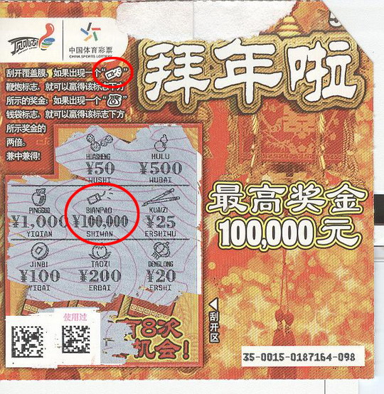 没等那位彩友走远,小吴就神秘的对销售员说:“我真的中了,一中还中了个大奖!”销售员以为他在说笑,但当这张稍有破损的“拜年啦”呈现在她面前时,她感慨到:“这就叫命中注定,你看序列号最后三位还很吉利‘098’,谐音就是你就发。”