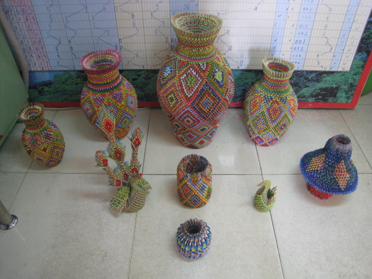 而今天笔者走访的一个站点看到的情景着实让人惊叹,呈现在面前的不是普通的小饰品,而是品种多样大大小小的花瓶,美丽多姿的天鹅、孔雀,五颜六色的笔筒……笔者赶快拿出相机,记录着这些从未见过的艺术品。