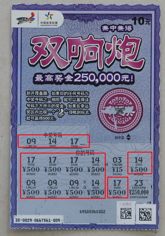 3月26日,又一位“双响炮”的中奖彩民前来兑奖,跟之前一位中“三重钻石”的彩民一样,这张彩票12个号码区,有10个都中了500元,奖金总计5000元。