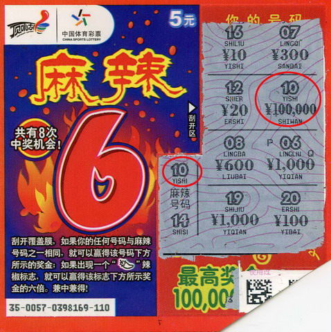 “麻辣6”以“辣椒红”为票面主色调,熊熊燃烧的火焰和弯弯的鲜红辣椒令人觉得暖意浓浓。该票种每张面值为5元,有8次中奖机会,最高奖金高达10万元!刮开区中,火红的辣椒图案下便是“你的号码”,火焰标志之下则是“麻辣号码”,刮开覆盖膜,如果你的任何号码与麻辣号码之一相同,就可以赢得该号码下方所示的奖金;如果出现一个辣椒标志,就可以赢得该标志下方所示奖金的6倍。该票种依然延续了顶呱刮的一贯特色,玩法简单有趣、返奖率高。