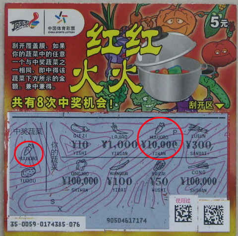 方先生(化名)平常就很喜欢刮“顶呱刮”,而且最喜欢做的事就是“抄底”,每次到了体彩站点总是先默不作声的在旁边看人家刮,看看一本只剩下几张或者十几张的时候,就会一口气把剩下的票全部买下然后闷头一阵猛刮。这次“红红火火”中的1万元也是这样来的,方先生15日晚在体彩点买下了那包票的最后20张,刮到最后几张的时候发现中奖区的“胡萝卜”在刮开区也出现了,下面的奖金显示10000元,方先生戏称这可是“金贵的胡萝卜”!