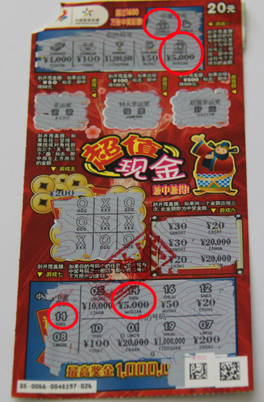 中年男子姓王,据王先生介绍,他平时就非常喜欢购买体育彩票,那天在家旁边一个体彩销售点看到一种新上市的即开型彩票“超值现金”,就随手拿了几张刮了起来,一连刮了五张都是中了20元。这时,朋友电话催他抓紧去吃饭,王先生用中得的20元又换了一张彩票装进口袋就去吃饭了。吃完饭回到家都是晚上10点多了,这时王先生想起来口袋里还有一张彩票没有刮。他便乘着酒兴将彩票拿出来刮了起来,“五千,中到五千。”刚刮了第一个游戏,王先生高兴地差点叫出声来。继续向下刮,当刮到最后一个游戏时,王先生兴奋地叫了起来:“又中了五千,这张彩票中了一万块。”家人听到声音也都高兴地围了过来。王先生拿着彩票笑着对家人说:“这种是新上市的超值现金,中到五千及以上奖金还有一台笔记本电脑哦。”