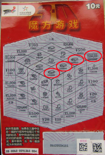 朱先生(化姓)四十来岁,是当地的职工,他在2003年就与体彩结下了不解之缘。4月份正值朱先生上中班,21日下午两点朱先生提早离了家,他来到了位于新建街的55856站点小坐片刻,顺便一试身手。这回朱先生相中的是10元票“3D魔方游戏”。“3D魔方游戏”是趣味性很强的票种,在一个三面立体魔方中,任意一面的行或列中出现三个相同的标志,即中得对应奖金。朱先生先花20元买了两张,刮开后中了10元,他用10元再换了一张,当刮到顶面第三行时,出现了三个相同的“钱包”图案,而后面对应的奖金竟然是“250,000”,该款游戏的最高奖项就这样稳落朱先生囊中。