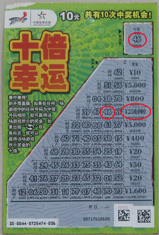 5月22日,章先生来到武进雪堰镇漕桥振兴路的04803体彩点,买了两张“十倍幸运”,都没中奖,他就有点奇怪,怎么会一张都没奖呢,不可能啊,于是又来了一张票。这次章先生来了个“倒推”,先刮奖金,看到“游戏四”奖金区是“¥250,000”,“游戏二”和“游戏五”奖金区都是“¥5,000”,心想,还是2个5000元的比较靠谱,随便中一个都行啊,25万肯定不会中,于是把那两个游戏区的号码刮开,结果没中。章先生一看除了25万,剩下的都是小奖了,那干脆就看看会不会中25万吧,意兴阑珊的刮开游戏四,结果发现这一排的号码,有一个“好面熟”,可不就是出现中奖号码“46”了嘛!章先生回忆说,自己当时大脑出现了短暂空白,不知道发生了什么事,回过神来的时候,心里乐翻了,自己真的是无比幸运!25万就这么到手了!