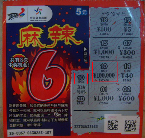 这么多即开品种为何偏偏挑中“麻辣6”,中奖彩民的回答很有意思:“我本人很爱吃辣,当然看到这种票面的彩票当然就禁不住买来刮了嘛。”平时就有刮即开彩票习惯的他,这次仅买了2张就刮出个10万。“当时可开心了!出来这么多年,这次总算可以给家里多汇点家用了。”另外,这位彩民还告诉我们,除了因为“麻辣情结”让其选择“麻辣6”,平时也很爱刮“超值现金”、“点石成金”。