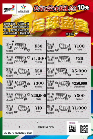据悉,“足球盛宴”每张10元,共有10个奖级,最高奖达到25万。整个票面以南非世界杯的流行色——红、绿、蓝为背景色,刮奖区的覆盖膜也具有世界杯特色,四个黄色的足球加一座小金杯,共有12次中奖机会,中奖方式也巧妙的运用了足球比赛的特点,每一个刮奖区代表一场比赛,刮开覆盖膜,在任意一场球赛中,如果你的球射进球门,即中得该场比赛右方所示奖金,兼中兼得。另悉,足球盛宴即开游戏也是体彩世界杯系列彩票第一个开售的玩法,而在即将到来的世界杯期间,电脑型体彩将奉献更多的精彩玩法,敬请广大彩友关注。
