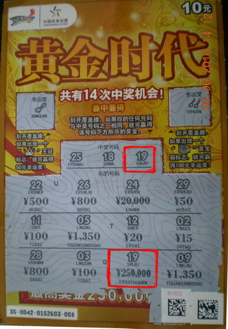 世博会正如火如荼地进行,很多人选择去上海看世博会,这次中奖的姜老先生也不例外。姜老先生的儿子在吴江上班,趁着世博会举办期间,姜先生把父亲和伯伯从老家接到了吴江,准备在双休日去上海看世博会。6月8日,姜先生的父亲和伯伯出去逛街期间,路过了三里桥旁边的即开型体彩销售站点,进去之后买了7张新到的票“黄金时代”,在第五张的最后一行里,数字“19”给了他一个大大的惊喜,25万元就这样产生了。