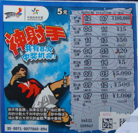 为迎接南非世界杯,体彩“顶呱刮”新票“神射手”于6月8日在南京上市,次日,位于南京清江路99号苏宁小商品市场的01265站点就爆出10万元大奖。据了解,这是“神射手”上市以来江苏的首个头奖。6月11日,南非世界杯开赛之前,这位“神射手”前来南京体彩中心领奖。