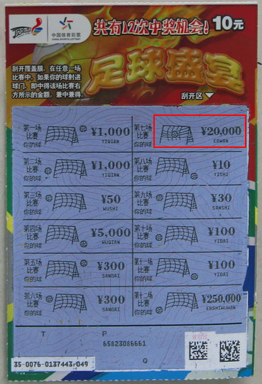 吴先生(化名)喜滋滋的说:“四年一度的世界杯让我热血沸腾,没想到看足球盛宴,还能赢‘足球盛宴’2万元奖金!看来我跟足球真的很有缘啊,回家跟老婆商量商量,准备换个大液晶看世界杯!”原来吴先生年少时就酷爱踢足球,那时候流行把偶像的海报贴在墙上,人家都贴娱乐明星的海报,但他的房间却是足球大腕扎堆贴,每年的暑假一有空闲就跟伙伴踢球,每每总是晒成小黑皮。工作后吴先生没有那么多的机会踢球,但还是关注足球,世界杯开赛以来他是场场不落。端午节休假时,吴先生走到体彩点买超级大乐透,想起好久没刮“顶呱刮”了,让销售员推荐点新票,一眼就相中了“足球盛宴”,成功揽获大奖2万元!
