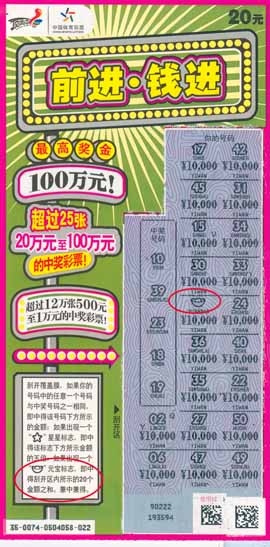 再看看这张“前进·钱进”的票面, 20 个“¥ 10,000 ”依次排开,就像是整装待发的战士;中间的金元宝,象征着首领,统领着 20 个奖金统一“钱进”。徐先生说,这个金元宝是他最后刮的,刮开经验丰富的他看不像是什么数字就先跳过了,幸好后来又仔细复看了一下。