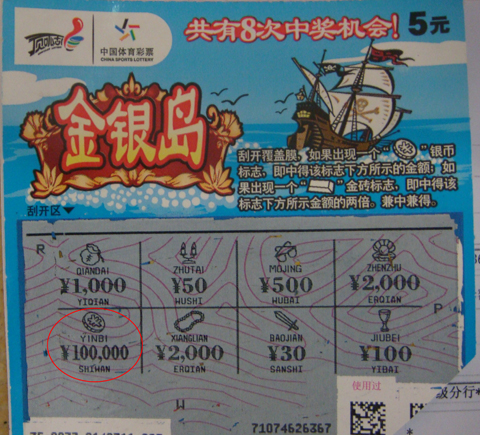 就在刮到最后一张的时候,大奖真的出现了,他刮出一个银币标志,中奖金额的地方则显示为“¥