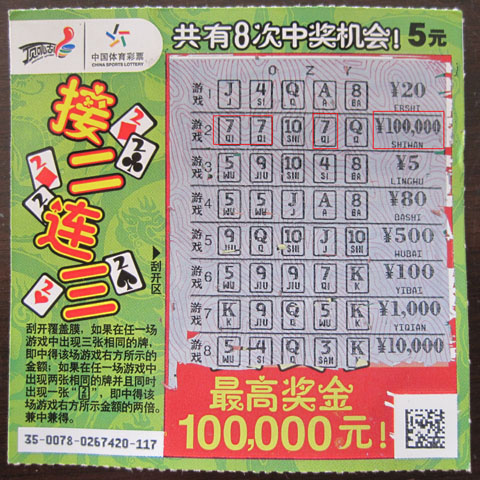 7月27日,连云港市东海县安峰镇07697体彩销售站中出“接二连三”10万元大奖,此次大奖的中出不仅促进了07907的销售,也掀起了东海县即开型彩票的抢购热潮。