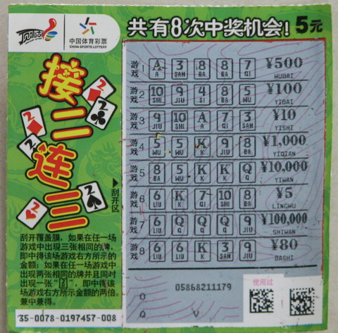 新票种“接二连三”每张5元,共有8次中奖机会,最高奖可达10万元。刮奖区中奖号码的覆盖膜是各种花色的扑克牌。刮开覆盖膜,如果在任一场游戏中出现三张相同的牌,即中得该场游戏右方所示金额;如果在任一场游戏中出现两张相同的牌并且出现一张“2er”的标志,即中得该场游戏右方所示金额的两倍,兼中兼得。中奖方式正好和票名很贴切“接二连三”。简单地说,三张牌相同即中奖,两张相同再来一张类似“百搭”的幸运牌就翻倍中奖。喜欢刮奖的朋友现在即可在各个体彩站点一试身手!(常州:小韩)