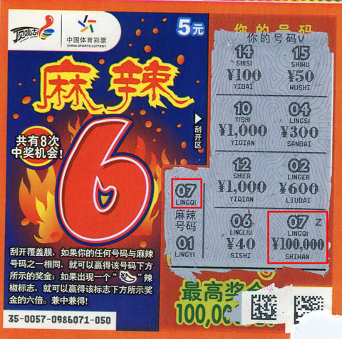 据悉,这次大奖出自徐州03725体彩销售站,位于鼓楼区九龙湖怡康花园对面,据站点销售员称,中奖者是位女彩民,年龄大概40岁左右,只买了1张“麻辣6”就中得大奖10万元!在谈及她的中奖经历时,更是令人羡慕,该彩民由于当天充电话费身上正好有5块零钱,路过03725体彩站点,就用这5元零钱买了1张“麻辣6”,有意思的是,刮开票面时,当时只看到中奖号码“07”下1后有1串0,本以为只中了1000元,后来经销售员确认后才知道是中了10万大奖!
