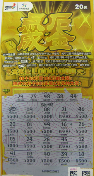 这是张非常特别的中奖票,刮开票面后并非是“中奖号码”和“你的号码”相对应而赢得号码下面的奖金,而是江先生用他的妙手刮到了个带“¥”的金砖符号,一举包揽了20个“你的号码”下的奖金,这可是“点石成金”最具魅力的地方。江先生说:“我当时刮开第一个号码就出现了个‘¥’金砖,就知中奖了,心一下子就提到了嗓子眼,因为不知下面是多少金额?接着往下刮,1个500、2个500、3个500……,全部刮开后竟然20个全是500,按票面说明,这些500当然全是我的了,总共1万元哪!”