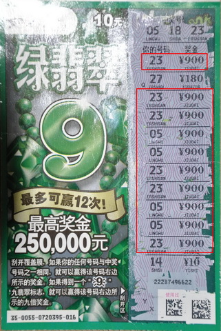 10月26日下午临近下班时,张家港体彩中心走进了一位打扮时尚的漂亮女孩,女孩进来后,径直走到了兑奖窗口掏出了一张10元面值的“绿翡翠”递给兑奖人员。经过确认,该张彩票中了9000元。