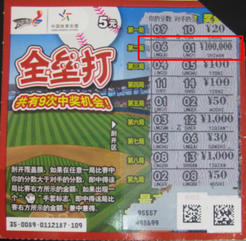 据07588站点业主李海燕先生介绍,10月31日(星期天)上午十点左右,此彩民来到站点,被门口张贴的精美即开宣传海报所吸引,进门就问有没有即开彩票,热情服务的李老板为王先生倒了一杯茶后介绍,今天上午刚到了即开新票“全垒打”。王先生被此票的精美画面所吸引,掏出三百元钱要买半本,让李老板帮挑半本,李老板把一整板的一分为二,说就是它了!王先生把票向口袋一放,说要带回家和家人一起刮奖并分享。临走的时候李老板来了一句:“祝你中个大奖呀!”王先生回了一句:“好的,没问题!”此话可谓金口玉言,中午十二点左右,王先生就打电话给李老板询问如中了十万怎么领奖,李老板把地址告诉了他。据悉王先生11月1日到连云港市体彩中心把大奖领走。