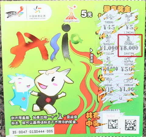 倍受瞩目的第16届广州亚运会即将于2010年11月12日开幕,近日通过购买即开型体育彩票顶呱刮支持亚运会的彩民也多了起来,小李(化名)就是其中一位,而且幸运地一击即中“和谐亚运”8000元奖金。