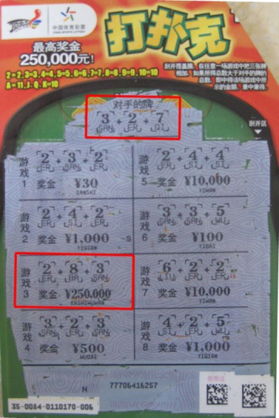 这天,恰逢休息日,他在站点和几个彩民打淮安跑得快,和牌友合作的非常好,一直从“2”打到“A”,借着这份手气他到柜台买了一张“打扑克”,希望能将这份喜气带到这张彩票上,谁知真的就中奖了,而且是25万元的大奖,他的那份激动溢于言表,还像孩子似的大叫着:“这张扑克牌赢得值啊!”