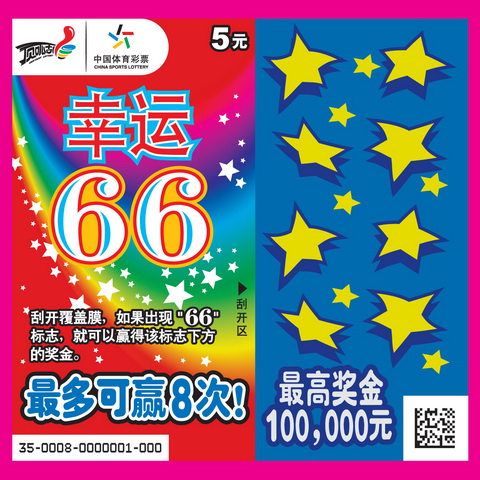 “幸运66”,面值5元,有8次中奖机会,最高奖金10元。玩法也十分简单,刮开覆盖膜,如果出现“66”标志,就可以赢得该标志下方的奖金。