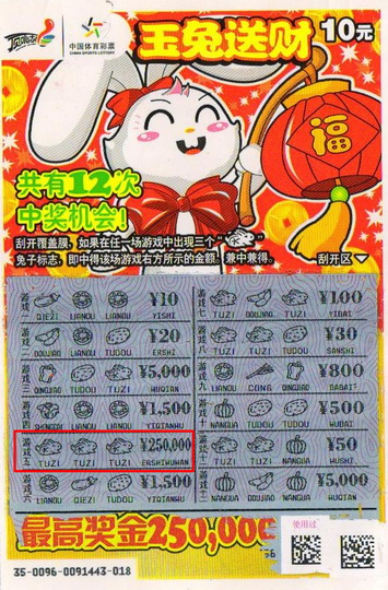 2月17日,盐城一彩民花10元中得体彩顶呱刮“玉兔送财”25万元大奖。