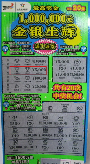 体彩即开“金银生辉”自在我省上市以来,表现十分强劲,不仅百万大奖被多次刮出,而5000元的奖级更是在广大彩友中屡见不鲜!