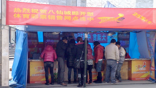 南通市八仙城即开社会网点位于南通市区繁华路段,市民逛街、娱乐的消费胜地“八仙城”。由于人流密集,该社会网点自09年5月4日定点开卖以来,销售一直十分火爆。尤其是近日,2月1日、7日,先后中出“冰火连赢”、“十倍幸运”25万大奖,加上春节喜庆,人气更是高到爆棚。网点也不负所望,年后,又陆续中得“红宝石”1万和刚刚上市的全国首款即开型彩票“金银生辉”5000元大奖。
