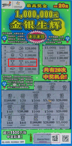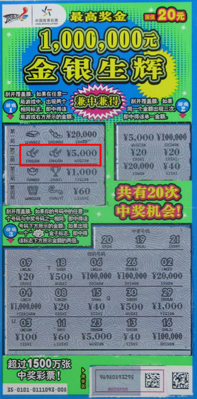 从4个5000元中奖票票面来看,游戏一出现两个相同标志即中得右方所示的奖金,仍旧是中奖热门区域,常州彩市首个百万大奖至今仍未现身,让我们拭目以待!(常州:小韩)