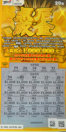 无独有偶,另一位中奖者小张(化姓)也是凭“金砖”标志一举囊括了“点石成金”20000元。小张在常熟某企业打工,他平时也极爱刮彩票,并专挑20元的票种,说是大奖更刺激。3月7日晚饭后,小张逛马路又逛到了小义新村55814体彩站点,他和业主周女士是老熟人了。周女士和他招呼:“哟!是不是今天又来碰碰彩运了啊,要什么票?”小张这次毅然选择了两张20元的老票种“点石成金”,不紧不慢刮起来。当刮到第二张时,最后一行第二个号码也显现了一个“金砖”标志,20个号码下的奖金都是1000元,20000元就这样飞入了他的口袋。(常熟体彩:唐莉)
