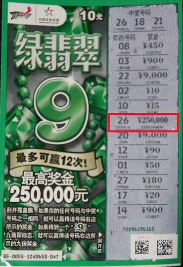 小李这张25万的大奖真可谓“天上掉下的馅饼”!平时小李都是买电彩较多,即开少有接触,前两天在销售员的介绍下,买了张“绿翡翠”,刮出了10元奖金,小李很开心,再接再厉拿了第二张,没想到竟然刮出了25万元大奖!小李很兴奋,这次的中奖体验转变了他原本认为的即开彩票很没意思的念头,大大提高了小李对即开彩票的兴趣,“刮了两张,每张都中奖,还刮出个25万!看来我跟这彩票缘分不浅啊。”